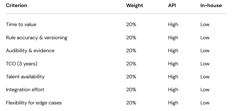 If “Time to value," “Auditability” and “TCO” matter most, the payroll compliance API path generally wins.